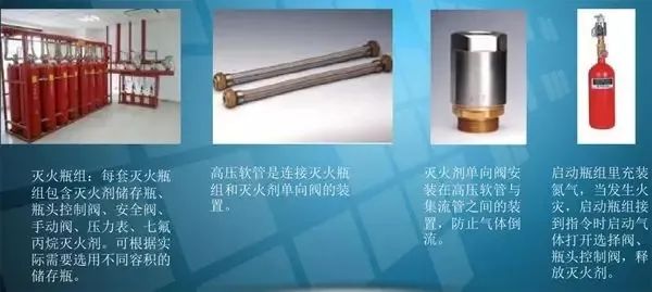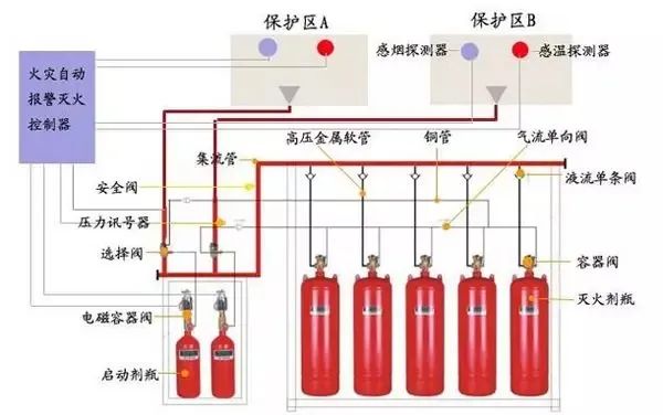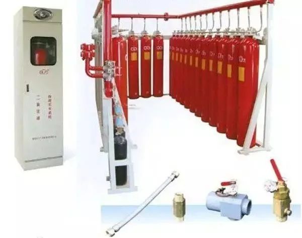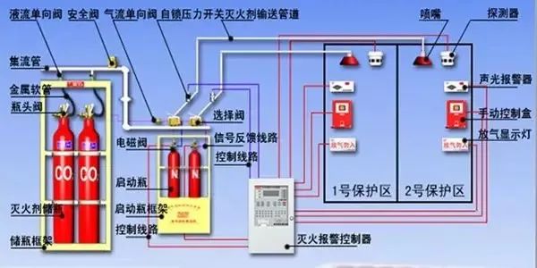 气体灭火系统是指平时灭火剂以液体、液化气体或气体状态存贮于压力容器内,灭火时以气体(包括蒸汽、气雾)状态喷射作为灭火介质的灭火系统。并能在防护区空间内形成各方向均一的气体浓度,而且至少能保持该灭火浓度达到规范规定的浸渍时间,实现扑灭该防护区的空间、立体火灾。系统包括贮存容器、容器阀、选择阀、液体单向阀、喷嘴和阀驱动装置组成。