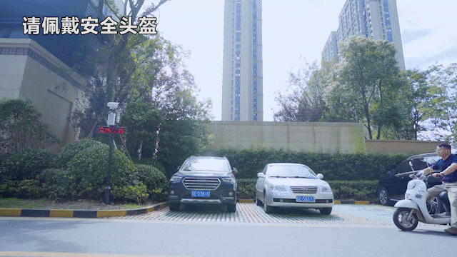 距离小区大门50米处,部署科达全结构化摄像机,摄像机抓拍识别头盔佩戴和车内安全带系扣情况,通过滚动文字和语音实时提醒小区居民佩戴头盔、系上安全带出行。