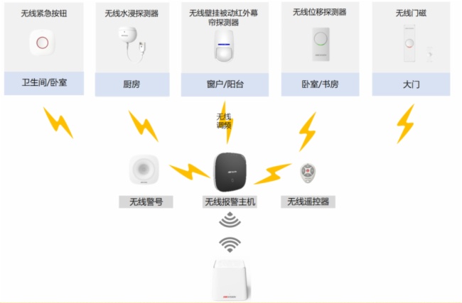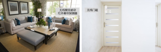 全屋部署无线探测设备,出现意外情况时,通过报警主机发出报警信号至报警中心,业主可及时接收报警消息,采取相应措施。