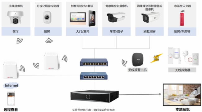 别墅综合安防解决方案,针对别墅大门、围墙周界、车库等重点区域进行视频监控部署,24小时关注覆盖,并且可实现远程预览,实时关注全屋情况。