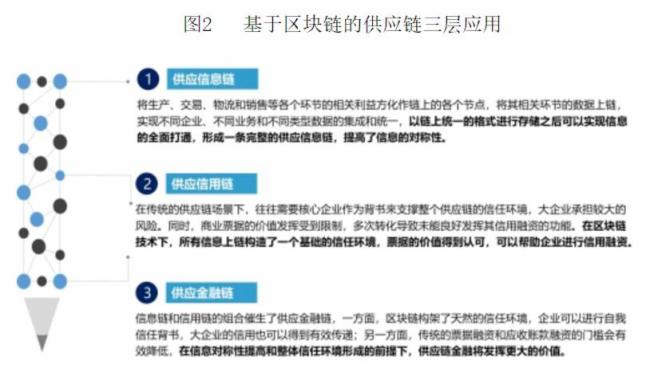 其次,区块链提供的信任系统和多主体治理机制能够服务于供应链金融的多主体协调,从而为供应链金融奠定新的网络化的治理生态。例如共享信息平台,预加密算法既可确保各方的隐私又可以保证数据质量,加快信息流通效率,同时可以解决供应链溯源问题,简化运营环节,降低沟通和交易成本。
