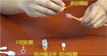 掰开防水胶圈,套入防水套主体和紧固螺帽之间的网线上,再套入防水帽主体。